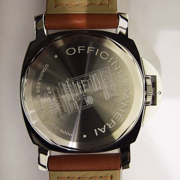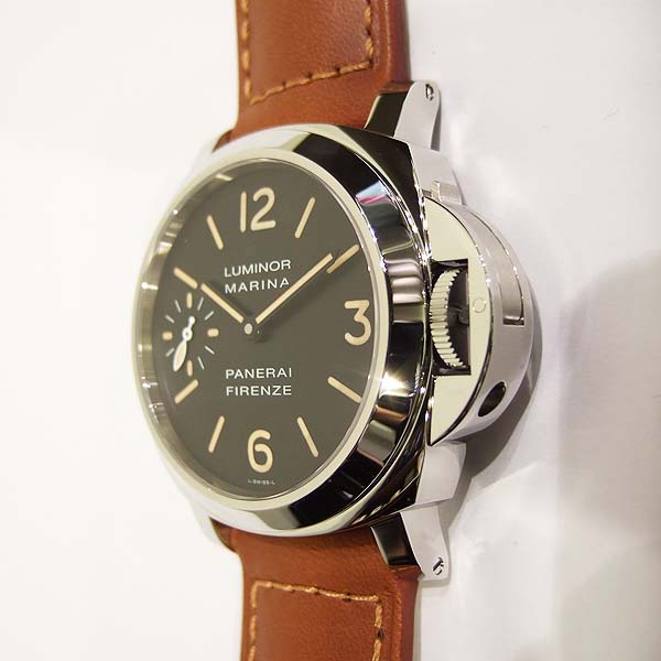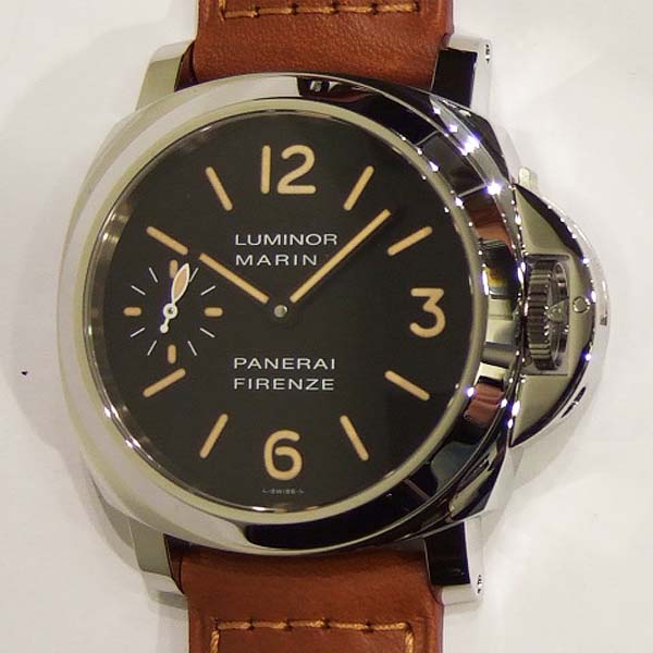 沛納海 Luminor Marina Florence 起源店專賣版腕錶/ 型號:PAM00001/ R 字頭限量 99 只/ 採 Panerai OP II 手上鏈機芯/ 機芯為:16 1/2法分ˋ17石ˋ單一金屬Glucydur擺輪ˋ每小時擺率21600次ˋIncabloc防震裝置ˋ動力儲存約 56 小時/ 錶殼 44mm 亮面 316L 鋼材質/ 特殊專利龍頭護橋/ 黑色面盤, 6 點方位印有Florence 字樣,舊化夜光指針及時標/ 藍寶石水晶玻璃(厚度3.5毫米),具抗反光塗層/ 錶背刻有 Florence 起源專賣店門面圖樣/ 防水達300米/ 附原廠棕色牛皮錶帶及替代用黑色膠帶各1條方便自行拆換.