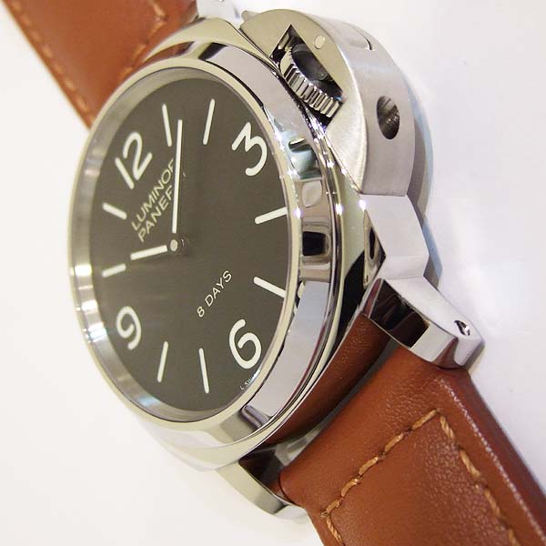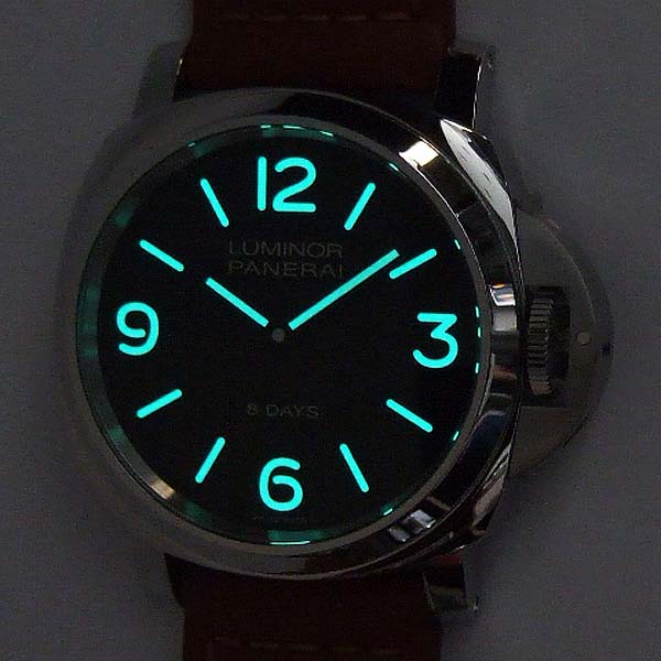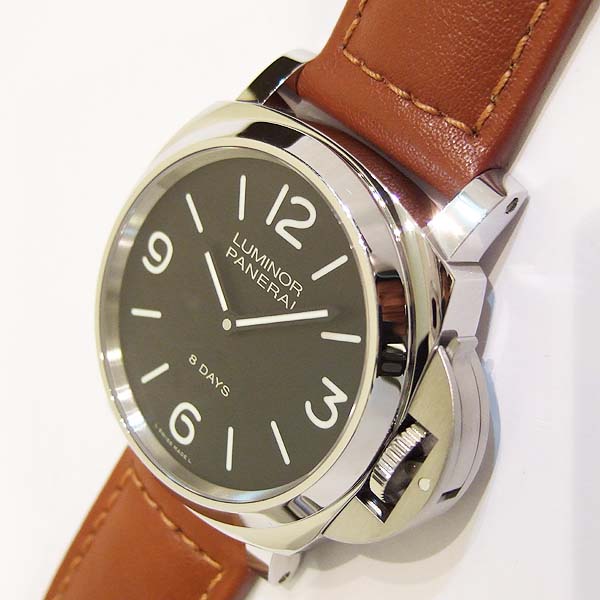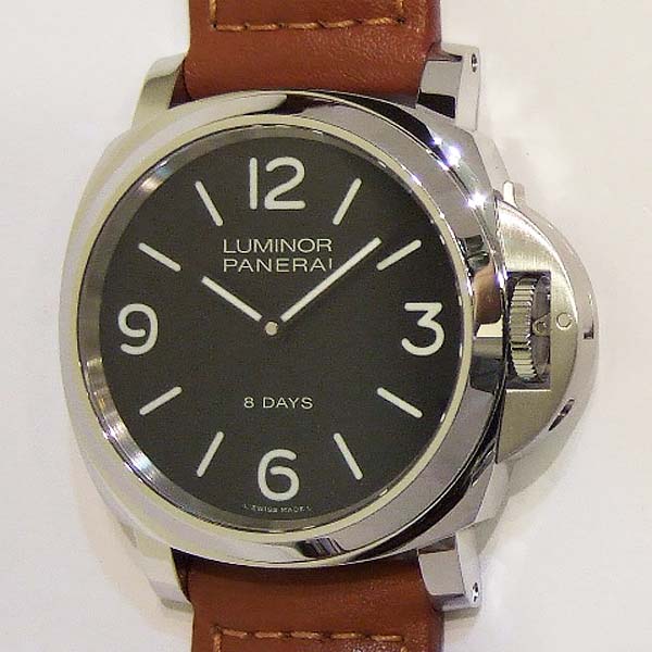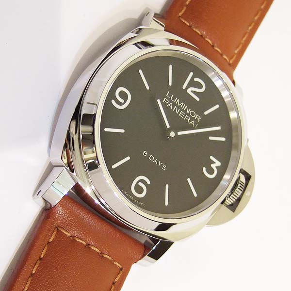 Luminor Base 8 Days Acciaio - 44mm 系列腕錶/ 型號:PAM00560/ R 字頭限量2000只/ 採Panerai自製 P5000 手上鏈機芯/ 機芯為:15 3/4法分ˋ21石ˋ厚4.5毫米ˋ每小時擺率21600次ˋKIF 防震裝置ˋ動力儲存 8 日ˋ2個發條盒ˋ127個零件/ 黑色面盤/ 夜光時標及指針/ 錶殼 44mm 亮面 AISI 316L 鋼材質/ 特殊專利龍頭護橋/ 藍寶石水晶玻璃(厚度2.5毫米)具抗反光塗層/ 透明錶背可見機芯/ 防水達300米/ 附黑色膠帶及原廠棕色皮帶各1條方便自行拆換,搭配梯形穿扣/ 盒內附一支螺絲起子。