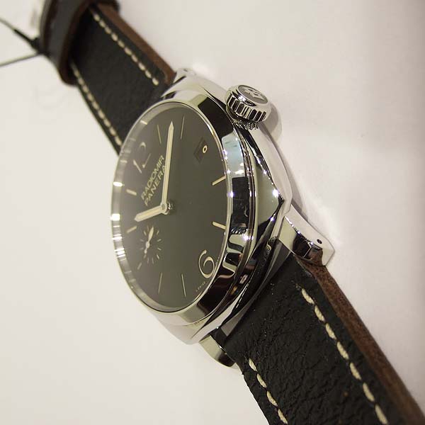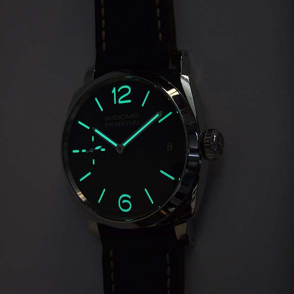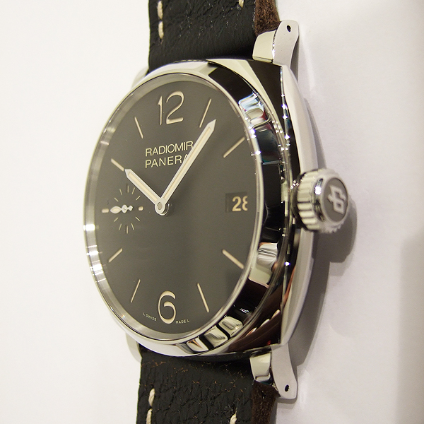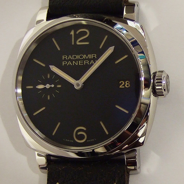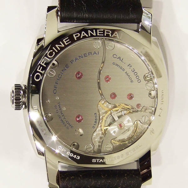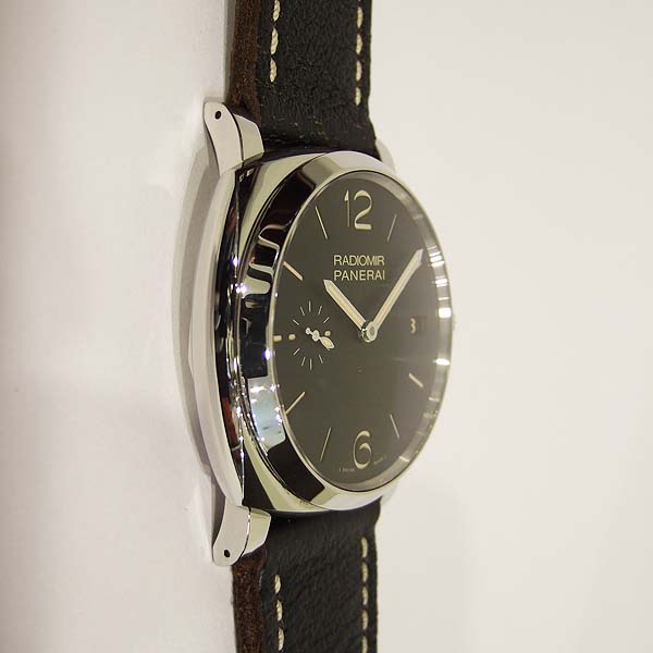 Radiomir 1940 3 Day - 47mm 3日鏈腕錶/ 型號:PAM00514/ P 字頭限量製作2500只/ 採自製編號:P.3000 手上鏈機芯, 厚:5.3mm,16 1/2法分, 21石, 2 個發條盒,Glucydur平衡擺輪,每小石震頻 21,600次,Incabloc防震裝置,完全由PANERAI研製/ 具時ˋ分ˋ指示, 3點方位日期顯示窗/ 黑色面盤(三明治面盤)/ 舊化處理夜光指針及時標/ 錶徑: 47 mm/ 精鋼拋亮錶殼/ 旋入式錶冠/ 大ㄇ型(普通型)鋼質扣頭/ 搭配原廠黑色荔枝紋路錶帶/ 藍寶石水晶鏡面及透明錶背/ 防水達100米.