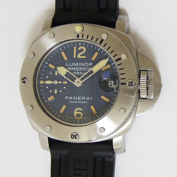 Luminor Submersible 1000 M 專業潛水腕錶/ 型號:PAM-00087/ E 字頭限量500只/採用Panerai OP III 自動上鏈機芯,21石,每小時擺率 28800次,Incabloc防震裝置,動力儲存約42 小時,獲天文台認證/ 具時ˋ分ˋ小秒針ˋ日期顯示/ 可旋轉錶圈可計算入水時間/ 錶殼44mm 316L 磨砂精鋼材質厚度 3 毫米/ 藍寶石水晶鏡面厚度 5.1 毫米/ 深藍錶盤/ 防水深達1000米/ 附原廠黑色膠帶配置原廠折疊式錶扣及原廠替代用潛水尼龍錶帶.