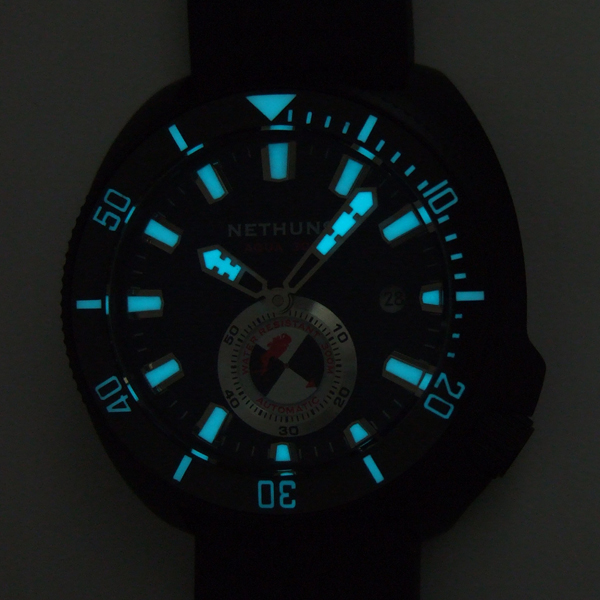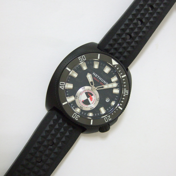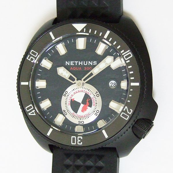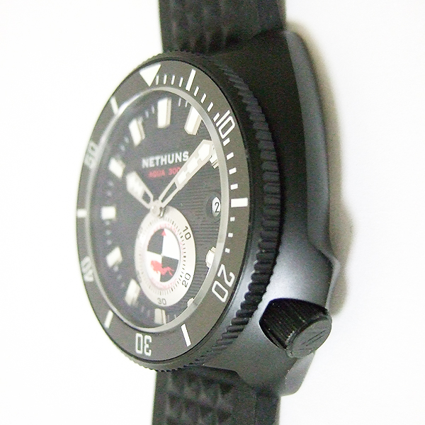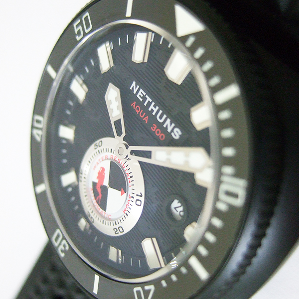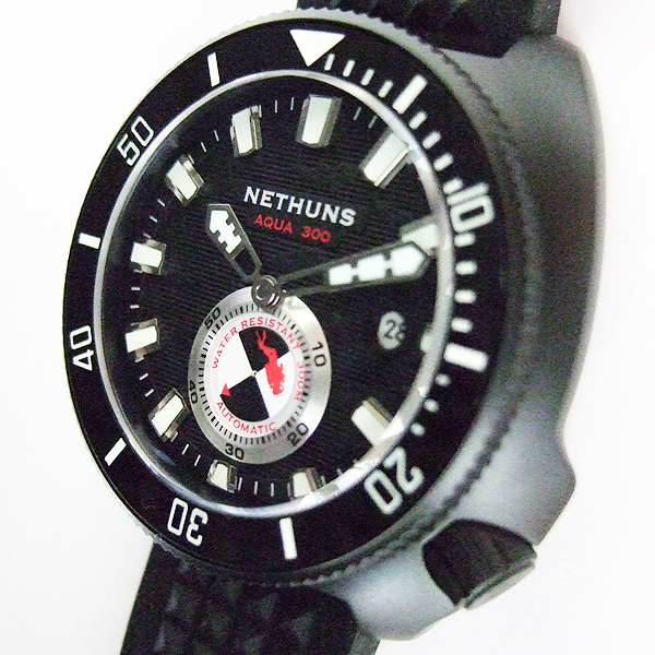 NETHUNS 義大利品牌 AQUA 300米 潛水腕錶/ 型號:AS331/ 採日本 Miyota 8218 自動上鏈機芯/ 機芯為:21石ˋ動力儲存約:40小時/ 具時ˋ分ˋ秒( 6 點方位恆動秒針盤,上有潛水員圖案)指示, 3 點方位日期窗/ 黑色面盤,有鯨魚ˋ鯊魚ˋ...等暗紋/ 立體時標(具夜光效果)/ 鋼材質錶殼,錶冠於 4 點方位/ 銀色邊劍型指針(具夜光效果)/ 黑色陶瓷可單向旋轉潛水外圈,可計算入水時間/ 手錶尺寸: 44mm錶徑/ 藍寶石水晶玻璃鏡面/ 霧面鋼錶底蓋,刻有序號/ 搭配 22mm 原廠黑色橡膠錶帶/ ㄇ字型一般鋼質穿扣/ 防水:300米. |