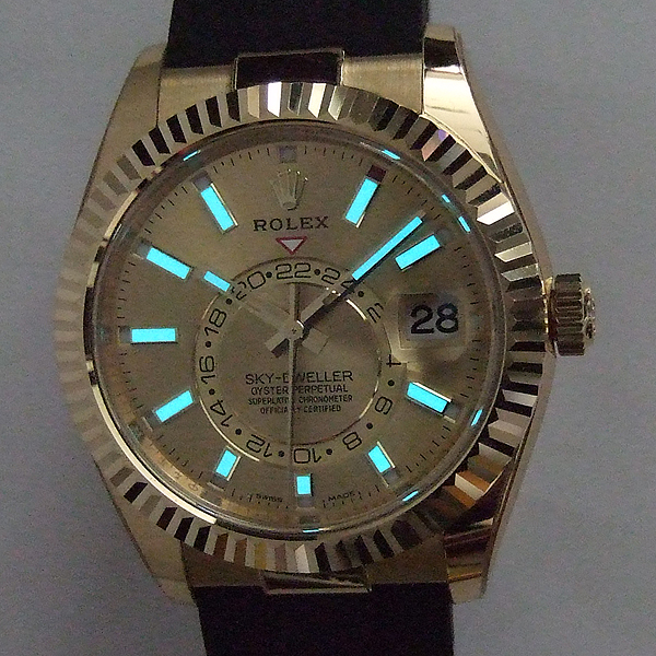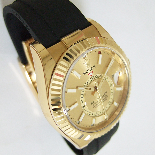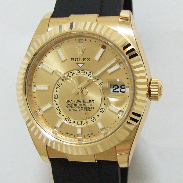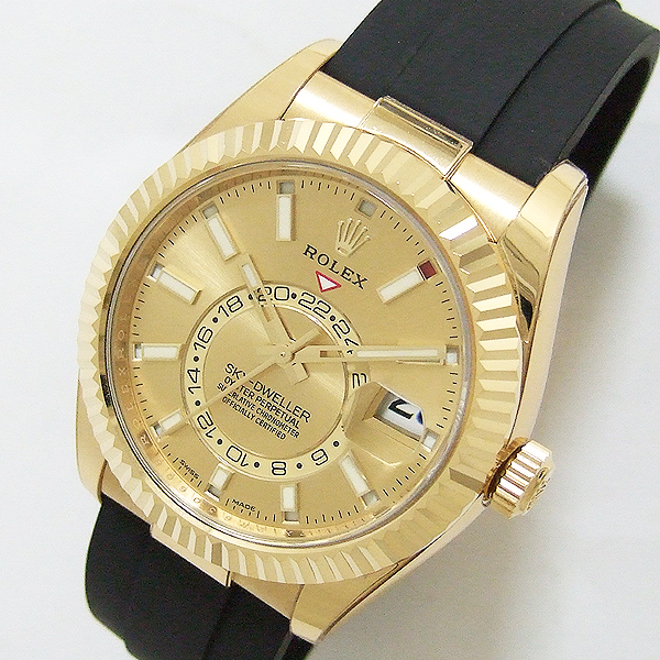 SKY-DWELLER 天行者年曆腕錶/ 型號:326238/ 亂碼字頭/ 採自動上鏈機芯/ 機芯編號:9001/ 錶徑:42mm/ 具時ˋ分ˋ秒ˋ放大鏡日期顯示,沙羅系統年曆功能,GMT兩地時間時區/ 金色面盤/ 有防偽刻印錶圈/ 立體夜光時標及指針/ Ring Command 雙向 4 段旋轉18K黃金外圈 /機芯為:鍍銠機芯有魚鱗紋打磨ˋ雙向自動上鏈ˋ動力儲存 70 小時/ 藍寶石水晶玻璃/ 原廠黑色橡膠錶帶/ 可微調摺疊扣/ 防水深度100米. |