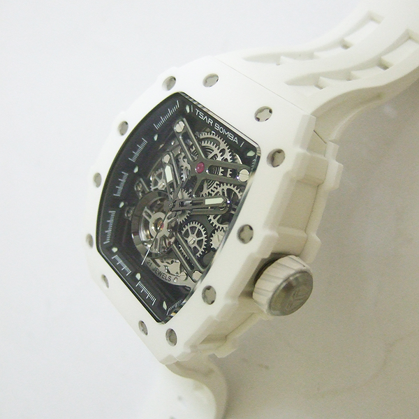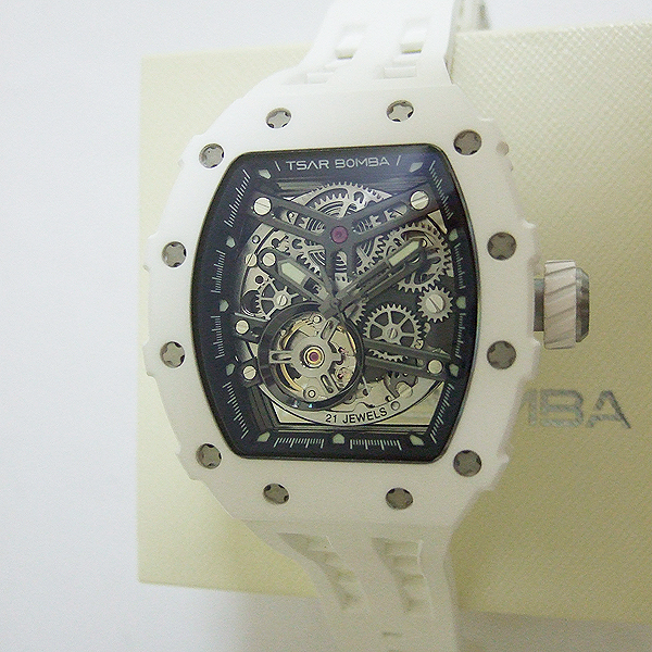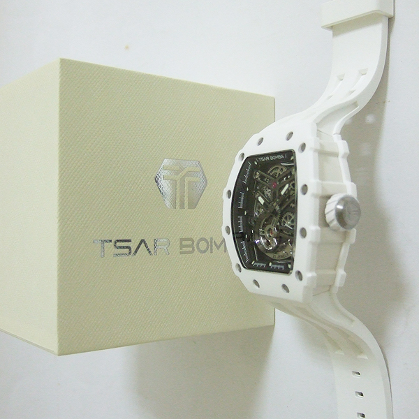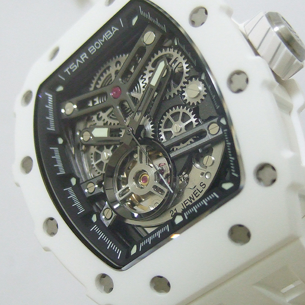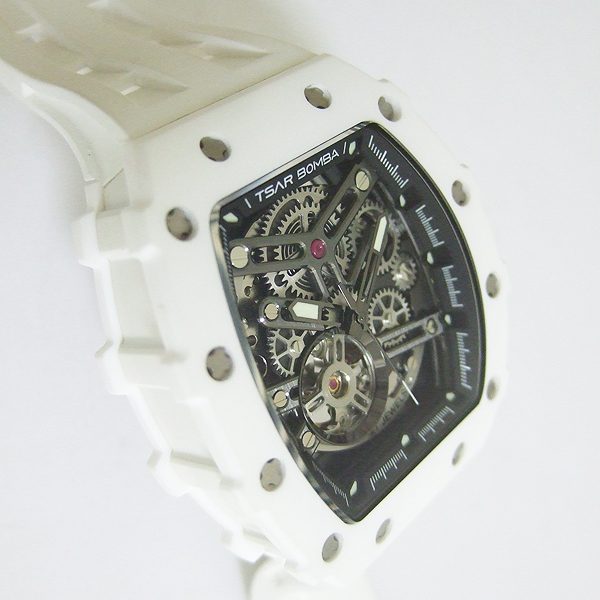 TSAR BOMBA 腕錶/ 型號:TB8208C/ 採日本自動上鏈機芯, 21 顆紅寶石, 動力儲存約:42小時/ 具時ˋ分ˋ秒指示/ 鏤空面盤/ 夜光指針及標誌型時標/ 錶殼白色陶瓷材質,搭配原廠白色橡膠錶帶,不銹鋼穿/ 手錶尺寸: 50.5 mmX 43mm 錶徑,厚:15.5mm / 藍寶石水晶水晶玻璃/ 防水: 50 米.