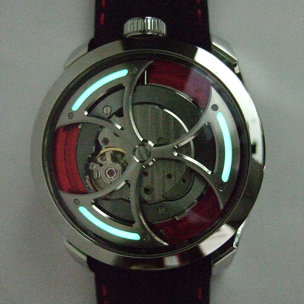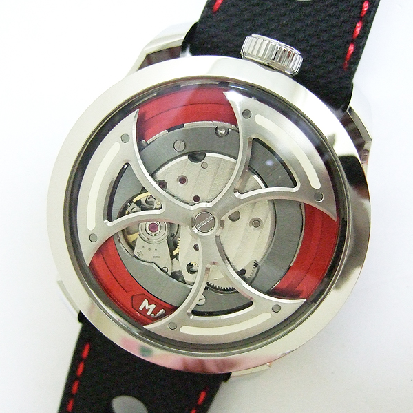 Mb & f 腕錶/ 型號:M.A.D. 1 錶面前置自動上鏈機芯,, 動力儲存:42小時/ 於錶殼 6 點方位顯示時ˋ分指示/ 錶面紅色底色,鏤空面盤,盡顯機械機芯打磨運作之美/ 夜光顯示自動上鍊盤/ 全錶拋光光 316 L 不鏽鋼材質/ 12 點方位設置錶冠/ 手錶尺寸: 42mm 錶徑/ 藍寶石水晶水晶玻璃/ 搭配原廠黑色紅線錶帶及折疊式錶扣/ 防水: 30 米. |