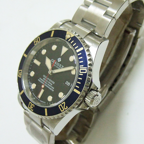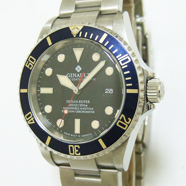 GINAULT 吉諾美國品牌潛水錶/ 型號:181270GSLN/ 採原廠自製編號:7275 自動上鏈機芯, 動力儲存:38小時/ 具時ˋ分ˋ秒指示及 3 點方位日期顯示/ 黑色面盤, 6 點方位4排白字/ 舊化夜光指針及標誌型時標/ 全錶拋霧 316 L 不鏽鋼材質/ 深藍色單向旋轉外圈,可計算入水時間/ 手錶尺寸: 40mm 錶徑/ 30.4弧形藍寶石水晶水晶玻璃/ 搭配原廠蠔式錶帶及折疊式錶扣/ 防水: 300 米(ISO 6425 認證潛水錶).