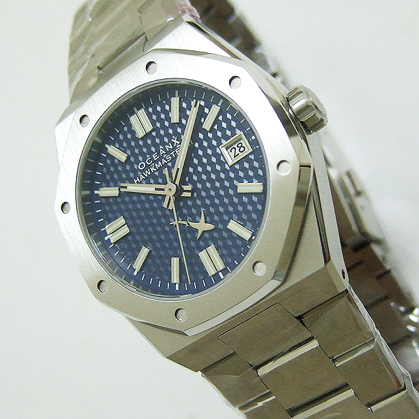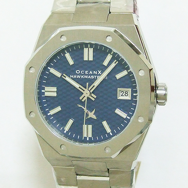 OceanX 腕錶/ 型號:HMS2112 / 採 Miyota 9015 自動上鏈機芯,動力儲存約:42小時, 24 顆紅寶石/ 藍色暗紋錶盤/ 具時ˋ分ˋ秒指示/ 夜光時標及標誌線時標/ 手錶尺寸: 39 mm錶徑,厚:10.89mm/ 藍寶石水晶玻璃/ 全錶 316 L 鋼材質/ 搭配原廠板式鋼質鏈帶及按壓式折疊式錶扣/ 防水 100 米.