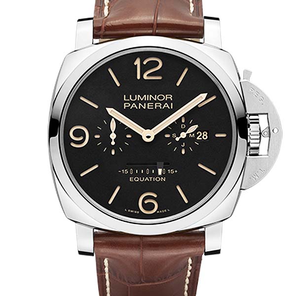 LUMINOR 1950 EQUATION OF TIME 8 DAYS ACCIAIO -47mm 系列腕錶/ 型號:PAM00601/ R 字頭限量100只/ 採 Panerai自製 P.2002 手上鏈機芯/ 機芯為:13 3/4法分ˋ31石ˋ厚8.30毫米ˋ每小時擺率28800次ˋ動力儲存 8 日ˋ328個零件/ 黑色面盤,9點位置設小秒針,3點位置設日期和月份顯示, 6 點方位設有時間等式顯示/ 舊化處理時標及指針,具夜光功能/ 錶殼 47mm 亮面 AISI 316L 鋼材質/ 特殊專利龍頭護橋/ 藍寶石水晶玻璃鏡面具抗反光塗層/ 透明錶背可見機芯/ 防水達100米/ 附原廠錶鱷魚皮復古棕色,淡褐色錶帶各 1 條方便自行拆換,搭配梯形穿扣/ 盒內附一支精鋼螺絲起子。