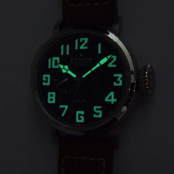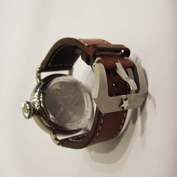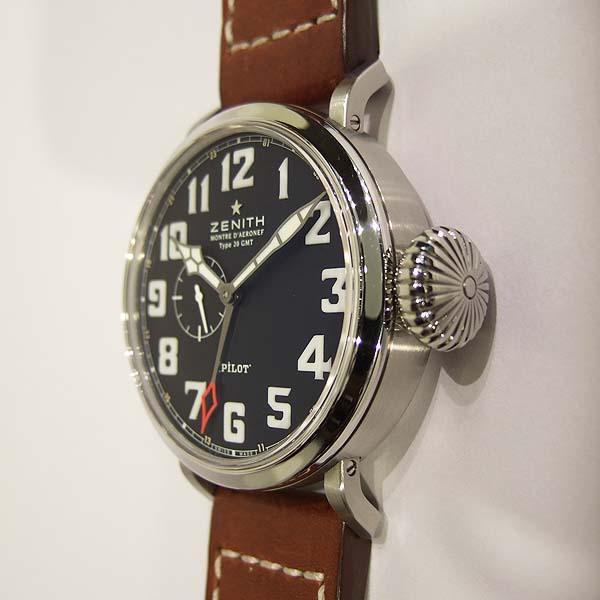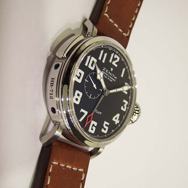 Pilot 系列飛行員軍錶/ 型號: F 0309/ 採 Zenith 自製自動上鏈機芯/ 機芯為:26石,動力儲存約:50小時/ 具時ˋ分ˋ秒指示及G.M.T兩地時間功能/ 黑色面盤/ 白色阿拉伯數字及標誌線時標(具夜光效果)/ 拋光鋼質錶殼,鋼質後底蓋(刻有飛行器圖樣)/ 大型軍錶錶冠/ 手錶尺寸: 48mm(含第 2 地時間調整按鈕) 錶徑ˋ厚:13.2mm/ AR 防眩藍寶石水晶玻璃鏡面/ 搭配 24mm 咖啡牛皮錶帶/ ㄇ字錶扣/ 防水: 100米. |