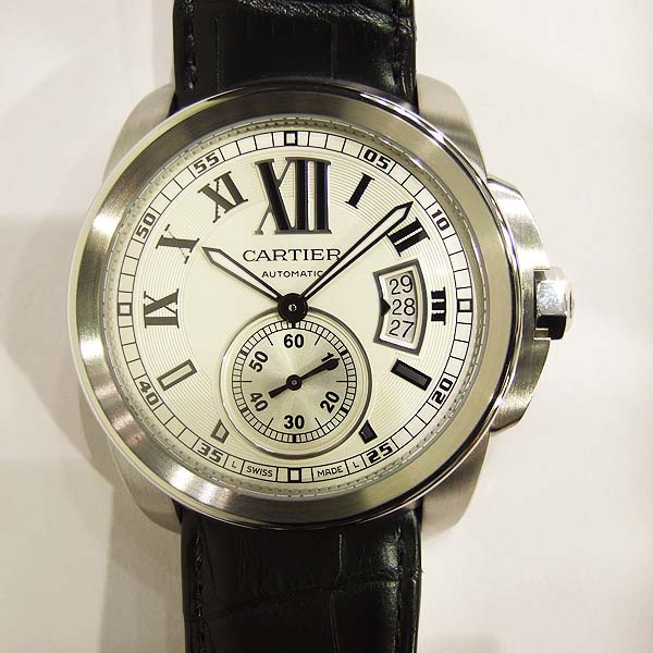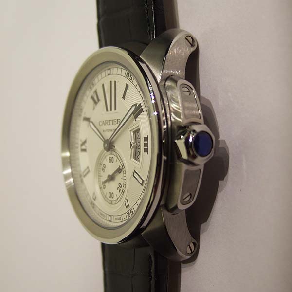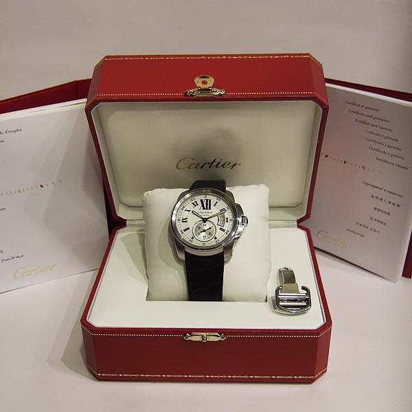 Calibre de Cartier 42mm 腕錶/ 型號:W7100037/ 採卡地亞原廠 1904-PS MC 型自動上鏈機心/ 具時ˋ分ˋ秒指示,日期顯示/ 白色暗紋錶面搭配黑色羅馬數字刻度/ 夜光指針 / 錶徑:42 mm / 錶冠鑲崁藍寶石/ 抗磨損藍寶石水晶鏡面/ 原廠黑色鱷魚皮錶帶,搭配原廠折疊式鋼質錶扣/ 日常生活防水 30 米. |