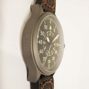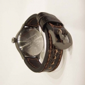 2.特色:啞黑色軍錶面盤ˋ舊化指針及時標ˋ鈦合金霧面噴砂舊化處理錶殼ˋ大型軍錶錶冠ˋ深咖啡色彷舊處理錶帶,兼具軍錶特色及時尚感.