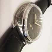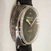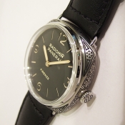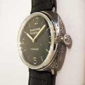 簡述: Radiomir 3 Day - 47mm 佛羅倫斯發源專賣店限量腕錶/ 型號:PAM-00604/ R 字頭僅限量製作 99 只/ 採自製編號:P.3000 手上鏈機芯, 厚:5.3mm,16 1/2法分, 21石, 2 個發條盒,Glucydur平衡擺輪,每小石震頻 21,600次,Incabloc防震裝置,3 天動力儲存, 2 個發條盒,160個零件,完全由PANERAI研製/ 具時ˋ分指示/ 三明治式刻度鏤空黑色面盤/ 金色指針/ 舊化處理夜光指針及時標/ 錶徑: 47 mm/ 鋼材質刻花錶殼/ 藍寶石水晶玻璃鏡面及透明後底蓋/ 防水達100米/ 搭配原廠黑色鱷魚皮錶帶/ 鋼質刻花ㄇ型(普通型)扣頭.