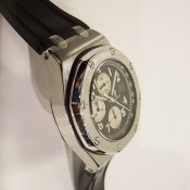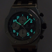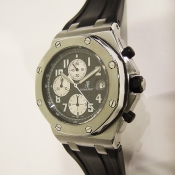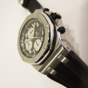 簡述: Royal Oak 皇家橡樹 Offshore 計時碼錶/ 型號:25721 ST/ 採自動上鍊機芯/ 錶徑:42mm/ 具時ˋ分ˋ小秒針及日期顯示/ 計時碼錶功能/ 黑色格紋面盤/ 螢光阿拉伯數字時標及指針/ 抗磨膠質錶框/ 機芯編號:2226-2840,機芯為: 21K金自動盤ˋ雙向自動上鏈/ 藍寶石水晶玻璃/ 防水100米/ 搭配原廠膠帶及鋼質折疊式錶扣.