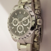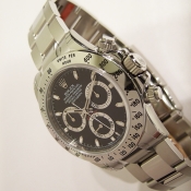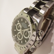 簡述: 勞力士蠔式宇宙計型迪通拿腕錶/ 型號:116520/ 亂碼字頭(有防偽 ROLEX 字樣及流水號碼內圈)/ 為不鏽鋼天文台錶/ 採自動上鏈機芯,機芯為:Cal:4130ˋ鍍銠機芯有魚鱗紋及日內瓦波紋打磨ˋ44顆紅寶石ˋ五方位調校ˋKIF避振裝置ˋ四臂環形合金擺ˋ、無快慢針由四顆螺絲微調快慢ˋ雙層合金游絲ˋ橫跨式橋板ˋ由柱狀星形凸輪控制計時碼錶的啟動.停止.歸零ˋ雙向自動上鏈/ 蠔式摺疊扣錶帶/ 刻有分度外圈方便即時計時速度ˋ生產速度等/ 旋入式表冠及旋轉按鈕錶冠/ 防水深達:100米/ 自動上鏈/ 黑色錶面/ 夜光時標及指針/ 藍寶石水晶鏡面.