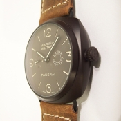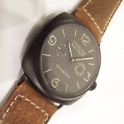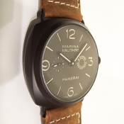 簡述: Radiomir Composite Marina Militare 8 Giorni 限量腕錶/ 型號:PAM-00339/ M 字頭僅製作1500只/ 採自製編號:P.2002/ 手上鏈機芯,3 個發條盒,完全由 PANERAI研製/ 具時ˋ分ˋ小秒指示/ 暗棕色(菸草色)面盤/ 3 點方位 8 Giorni BREVETTATO 字樣/ 夜光指針及時標/ 具 8 天動力儲存/ 錶徑: 47 mm/ 陶化鋁錶殼/ 藍寶石水晶玻璃鏡面/ 防水達100米/ 搭配原廠身咖啡色作舊牛皮錶帶/ ㄇ型一般穿扣.