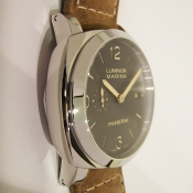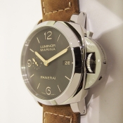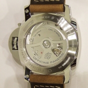 簡述: Luminor 1950 Marina 3 Day 香港限定版自動腕錶/ 型號:PAM-00608/ Q 字頭限量100只(可快拆式錶帶)/ 採用Panerai P.9000 自動上鏈機芯/ 機芯為:13 3/4 法分ˋ 28石ˋ 每小時擺率 28800次ˋ Incabloc防震裝置ˋ 動力儲存 3 日/ 具時ˋ分ˋ小秒針ˋ日期顯示/ 錶殼44mm 316L 拋光及霧鋼材質/ 錶冠護橋上刻印有 HONG KONG 字樣/ 菸草色錶面(三明治錶盤)/ 舊化處理夜光時標及指針/ 藍寶石水晶鏡面/ 防水達300米/ ㄇ型錶扣/ 附原廠黑色膠帶及棕色舊化牛皮錶帶.