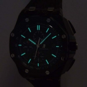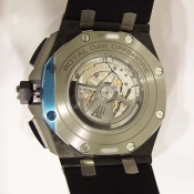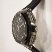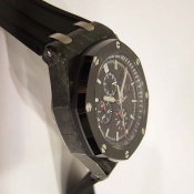 簡述: Royal Oak Offshore 皇家橡樹離岸型計時碼錶/ 型號:26400AU.OO.A002CA.01/ 採自動上鏈機芯,機芯為:自製編號: 3126/3840 機芯,22K金雕花自動盤,49顆紅寶石,鍍銠機芯有魚鱗紋及日內瓦波紋打磨,五方位調校,KIF避振裝置,砝碼補償擺輪,扁平式合金游絲/ 錶徑:44mm/ 具時ˋ分ˋ小秒針及日期顯示/ 計時碼錶功能/ 黑色格紋面盤/ 銀色時標及指針/ 黑色內圈有速率標示/ 鍛造碳錶殼/ 鈦合金底蓋/ 黑色陶瓷錶框及計時碼錶按鈕/ 旋入式錶冠/ 藍寶石水晶玻璃及透明底蓋/ 防水100米/ 搭配原廠黑色橡膠錶帶及鈦合金穿扣(一般扣).