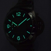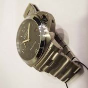 簡述: Luminor 1950 Marina 3 Day 自動腕錶/ 型號:PAM-00352/ R 字頭限量 500 只/採用 Panerai P.9000 自動上鏈機芯/ 機芯為:13 3/4 法分ˋ 28石ˋ 每小時擺率 28800次ˋ Incabloc防震裝置ˋ 動力儲存 3 日/ 具時ˋ分ˋ小秒針ˋ日期顯示/ 錶殼44mm 鈦合金材質/ 菸草色錶面(三明治錶盤)/ 夜光時標及指針/ 藍寶石水晶鏡面/ 防水達300米/ 附原廠鈦合金鏈帶及折疊式錶扣.