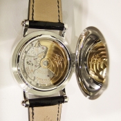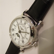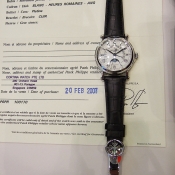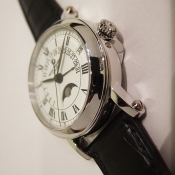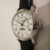 簡述: 百達翡麗萬年曆錶/ 型號:5059 P/ 採自動上鏈機芯,機芯為:Cal.315 S-ORˋ鍍銠機芯有魚鱗紋及日內瓦波紋打磨ˋ30石ˋ五方位調校ˋKIF避振裝置ˋ四臂環形砝碼補償擺輪ˋ有四顆砝碼微調快慢ˋ機心烙有日內瓦印記ˋ21K金自動盤/ 銀白色面盤/ 羅馬數字時標/ 外圍有阿拉伯數字分標示/ 黑色柳葉形K金指針/ 具時ˋ分ˋ秒針指示及星期ˋ日期ˋ閏年ˋ月相盈虧顯示ˋ彈跳式日期指針/ 透明錶背附有可掀式防塵後底蓋/ 弧形藍寶石水晶鏡面/ 原廠鱷魚皮帶及鉑金折疊扣/ 日常生活防水25米.