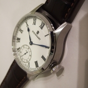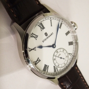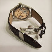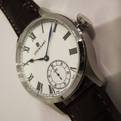 簡述: Steinhart 德國品牌/ MARINE CHRONOMETER 44, Roman 腕錶/ 型號:105-0307 / 採瑞士 Unitas 6498 手上鏈機芯/ 機芯為:17石ˋ動力儲存:42小時ˋ日納瓦波紋打磨ˋ粉紅金鍍金機芯/ 具時ˋ分ˋ秒指示/ 白色面盤/ 羅馬數字及標誌線時標/ 藍鋼桃形指針/ 手錶尺寸: 44mm錶徑,厚:14.2mm,重:125 公克/ AR 塗層藍寶石水晶玻璃鏡面/ 透明錶底蓋/ 搭配 22mm 咖啡色鱷魚皮壓紋牛皮錶帶/ 折疊式鋼質錶扣/ 防水: 30米.