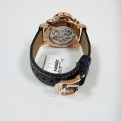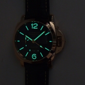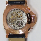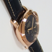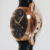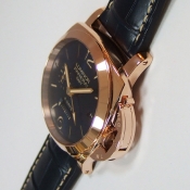 簡述: Luminor 1950 8 Days GMT 8日動力雙時區特別訂製錶/ 型號:PAM-00623/ R 字頭僅限量製作 30 只/ 採自製P.2002/1 手上鏈機芯,完全由PANERAI研製/ 具時.分.小秒.日期顯示/ 12小時制第 2 地時區顯示指針/ 9 點方位日夜顯示指示盤/ 秒針對時歸零裝置/ 3 個發條盒/ 8 天動力儲存橫列式線形顯示/ 錶徑: 44 mm,18 K玫瑰金錶殼/ 藍寶石水晶玻璃鏡面及後底蓋(可見原廠自製機芯鏤空處理)/ 獨特錶冠護橋/ 藍色金屬光澤錶面,夜光時標及6.12阿拉伯數字/ 防水達100米/ 原廠深藍鱷魚皮錶帶.