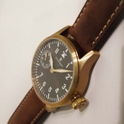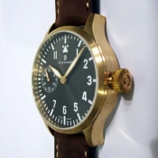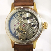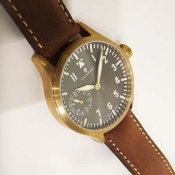 簡述: STEINHART 德國品牌軍錶/ Nav B-Uhr 44 handwinding系列/ 型號:107-0234/ 採瑞士 Unitas 6497-1 手上鏈機芯/ 機芯為:17石ˋ動力儲存:42小時/ 具時ˋ分ˋ秒指示/ 灰色面盤/ 阿拉伯數字及標誌線時標/ 金色指針(具夜光效果)/ 手錶尺寸: 44mm錶徑,厚:14.2mm,重:107 公克/ AR 塗層防炫藍寶石水晶玻璃鏡面/ 透明錶底蓋/ 搭配 22mm 咖啡色舊化牛皮錶帶/ ㄇ字型青銅質錶扣/ 日常生活防水: 30米.