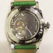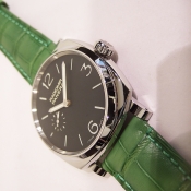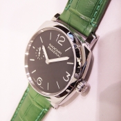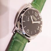 簡述: Radiomir 1940 3 Day - 42mm 腕錶/ 型號:PAM00512/ R 字頭限量製作1000只/ 採自製編號:P.999/1 手上鏈機芯,直徑:26.3mmm, 厚:3.4mm, 19石, 2 個發條盒,Glucydur平衡擺輪,每小石震頻 21,600次,Incabloc防震裝置,動力儲存 60 小時,完全由PANERAI研製/ 具時ˋ分ˋ指示/ 黑色面盤(三明治面盤)/ 夜光指針及時標/ 錶徑: 42 mm/ 精鋼拋亮錶殼/ 旋入式錶冠/ 大ㄇ型(普通型)鋼質扣頭/ 搭配原廠綠色鱷魚皮錶帶/ 藍寶石水晶鏡面及透明錶背/ 防水達100米.
