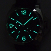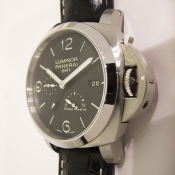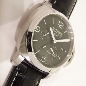 簡述: Luminor 1950 Marina 3 Day GMT Power Reserve 自動腕錶/ 型號:PAM-00321/ R 字頭(可快拆式錶帶),限量2500只/ 採用Panerai自製 P.9002 自動上鏈機芯/ 機芯為:13 3/4 法分ˋ 29石ˋ 每小時擺率 28800次ˋ Incabloc防震裝置ˋ 動力儲存 3 日/ 具時ˋ分ˋ小秒針ˋ日期顯示,第 2 地時間指示,動力儲存顯示,秒針歸零裝置/ 錶殼44mm 316L 拋光及霧鋼材質/ 黑色錶面(三明治錶盤)/ 夜光時標及指針/ 藍寶石水晶鏡面/ 防水達300米/ ㄇ型錶扣/ 附原廠黑色膠帶及黑色鱷魚皮錶帶.