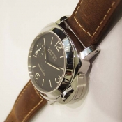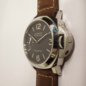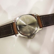 | 沛納海 Luminor Marina 城市限定系列吉達版/ 型號:PAM 00456/ O 字頭限量 150 只/ 採Panerai OP II 手上鏈機芯/ 機芯為:16 1/2法分ˋ17石ˋ單一金屬Glucydur擺輪ˋ每小時擺率21600次ˋIncabloc防震裝置ˋ動力儲存約 56 小時/ 錶殼 44mm 亮面 316L 鋼材質/ 特殊專利龍頭護橋/ 黑色面盤, 6 點方位有潛艇載具(人豬)浮雕,夜光指針及時標(舊化感處理),錶背刻印有中東棕梠樹及軍刀圖樣/ 藍寶石水晶玻璃(厚度3.5毫米),具抗反光塗層/ 防水達300米/ 附原廠棕色舊化處理牛皮錶帶及黑色橡膠錶帶. |