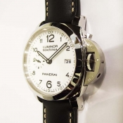 簡述: Luminor 1950 Marina 3 Day 自動腕錶/ 型號:PAM-00499/ 採用Panerai P.9000 自動上鏈機芯/ 機芯為:13 3/4 法分ˋ 28石ˋ 每小時擺率 28800次ˋ Incabloc防震裝置ˋ 動力儲存 3 日/ 具時ˋ分ˋ小秒針ˋ日期顯示/ 錶殼44mm 316L 拋光及霧鋼材質/ 白色錶面,阿拉伯數字時標/ 夜光時標及指針/ 藍寶石水晶鏡面/ 防水達300米/ 原廠ㄇ型扣(一般扣)/ 附原廠黑色膠帶及黑色牛皮錶帶.
