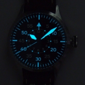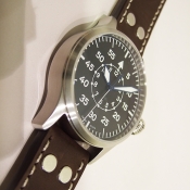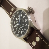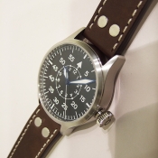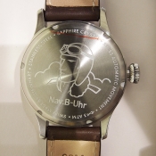 簡述: Steinhart 德國品牌軍錶/ Nav B-Uhr 44 Automatik B-Muster 飛行員軍錶/ 型號: 107-0342/ 採瑞士 ETA2824-2 自動上鏈機芯/ 機芯為:25石ˋ動力儲存約:42小時/ 具時ˋ分ˋ秒指示/ 黑色面盤/ 阿拉伯數字及標誌線時標/ 藍色邊緣指針(具夜光效果)及時標/ 鋼質霧面噴砂舊化處理錶殼,鋼質後底蓋(刻有飛行員頭像)/ 大型軍錶錶冠/ 手錶尺寸: 44mm 錶徑ˋ厚:14.2mmˋ重 107公克 / 藍寶石水晶玻璃鏡面/ 搭配 22mm 深咖啡色彷舊處理錶帶/ ㄇ字錶扣/ 防水: 30米.