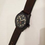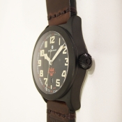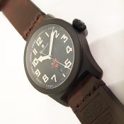 簡述: MILITARY 42 automatic black 腕錶/ 型號:107-0634 / 採 ETA2824-2 自動上鏈機芯,機芯 25 石,動力儲存約:42小時/ 具時ˋ分ˋ秒大三針指示, 6 點方位日期窗/ 黑色面盤, 6 點方位印有紅鷹徽章及 SMILTARY 字樣/ 舊化指針具夜光效果/ 舊化處理阿拉伯數字具夜光效果/ 標誌型分標/ 全錶 316 L 不鏽鋼材質黑色 DLC 處理/ 手錶尺寸: 42mm 錶徑,厚:13 mm ,重 100克 / 防炫藍寶石水晶玻璃/ 搭配原廠 22mm 咖啡色錶帶及鋼質錶扣(穿扣)/ 防水: 100 米