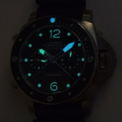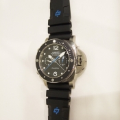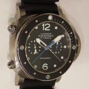 簡述: Luminor Submersible 1950 3 Days Chrono Flyback Automatic Titanio 3日動力儲存飛返計時鈦金屬腕錶/ 型號:PAM00615/ S 字頭限量 500 只/ 採用 Panerai P.9100/R 自動上鏈機械式機芯,完全由沛納海研製,13法分,厚9.55毫米,37石,GlucydurR平衡擺輪,每小時振動28,800次,Incabloc R防震裝置,3天動力儲存,兩個發條盒/ 具時ˋ分ˋ小秒針飛返計時(可累計計時共12小時30分60秒)/ 錶殼47mm 磨砂鈦金屬材質,10點鐘和8點鐘位置設磨砂鈦金屬鐫刻計時功能按鈕/ 藍寶石水晶玻璃,厚度1.6毫米,抗反光塗層及透明底蓋/ 專利特殊龍頭護橋/ 刻有 PANERAI 標誌的橡膠錶帶,配梯形磨砂鈦金屬錶扣,附一條備用皮質錶帶/ 防水300米.