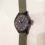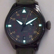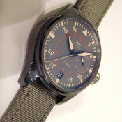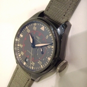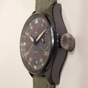 簡述: BIG PILOTS TOP GUN 大飛行員 7 日鏈腕錶/ 採自製自動上鏈機芯/ 具時ˋ分ˋ秒指示/ 6 點方位日期窗顯示/ 3點方位長效七日動力儲存顯示盤/ 炭泥灰色錶面/ 舊化指針及時標(具夜光效果)/ 錶俓:47mm/ 黑色陶瓷錶殼,鈦合金後底蓋,鈦合金錶冠/ 藍寶石水晶鏡面/ 防水60米/ 搭配原廠軍綠色帆布蒙皮錶帶/ 原廠鈦合金ㄇ型一般穿扣.