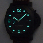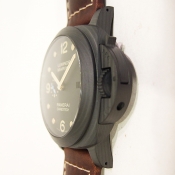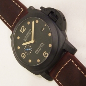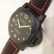 簡述: Luminor Marina 1950 Carbotech 3 Day 自動腕錶/ 型號:PAM-00661/ S 字頭限量 1000 只(可快拆式錶帶)/ 採用Panerai P.9010 自動上鏈機芯/ 機芯為:P.9010自動上鏈機械機芯,完全由沛納海研製,13¾法分,厚6.0毫米,31石,Glucydur®平衡擺輪,每小時振動28,800次。Incabloc®防震裝置, 3日動力儲存,兩個發條盒, 200 個件零/ 具時ˋ分ˋ小秒針ˋ日期顯示/ 錶殼44mm 碳纖維複合材質/ 黑色錶面附夜光阿拉伯數字及小時標示時標, 3點鐘位置設日期顯示,9點鐘位置設小秒盤(小秒針為藍色)/ 藍寶石水晶鏡面/ 防水達300米/ 原廠ㄇ型扣(一般扣)/ 附原廠黑色膠帶及咖啡色牛皮錶帶.