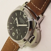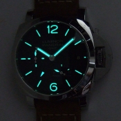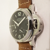 簡述: Luminor 1950 3 Day GMT Power Reserve 42mm 自動腕錶/ 型號:PAM-00537/ S 字頭限量1000只(可快拆式錶帶)/ 採用Panerai自製 P.9002 自動上鏈機芯/ 機芯為:13 3/4 法分ˋ 29石ˋ 每小時擺率 28800次ˋ Incabloc防震裝置ˋ 動力儲存 3 日/ 具時ˋ分ˋ小秒針ˋ日期顯示,第 2 地時間指示,動力儲存顯示/ 錶殼42mm 316L 拋光及霧鋼材質/ 黑色e格紋錶面/ 夜光時標及指針/ 藍寶石水晶鏡面/ 防水達300米/ ㄇ型錶扣/ 搭配原廠咖啡色麂皮錶帶.