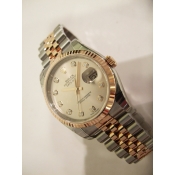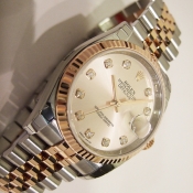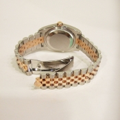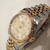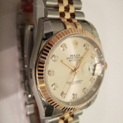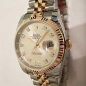 簡述: DATEJUST 蠔式天文男裝腕錶/型號:116231/ 採自動上鏈機芯(機芯編號:3135)/ 機芯為 31 顆紅寶石, 五方位調校,雙層合金游絲,有四顆微調快慢螺絲,橫跨式擺輪橋板,KIF避振裝置,天文台認證(C.O.S.C.)/ 錶徑:36mm/ 具時ˋ分ˋ秒針指示及 3 點方位日期顯示窗/ 玫瑰金色面盤/ 玫瑰金色指針/ 包鑲刻度鑽石時標(共10顆)/ 18K金錶圈/ 錶盤內圈刻有一圈防偽 ROLEX 字樣及流水號碼/ 藍寶石水晶玻璃鏡面/ 原廠不鏽鋼及18K玫瑰金五珠式錶帶及折疊式錶扣/ 防水100米.