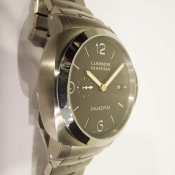 簡述: Luminor 1950 Marina 3 Day 自動腕錶/ 型號:PAM-00352/ R 字頭限量 500 只/採用 Panerai P.9000 自動上鏈機芯/ 機芯為:13 3/4 法分ˋ 28石ˋ 每小時擺率 28800次ˋ Incabloc防震裝置ˋ 動力儲存 3 日/ 具時ˋ分ˋ小秒針ˋ日期顯示/ 錶殼44mm 鈦合金材質/ 菸草色錶面(三明治錶盤)/ 夜光時標及指針/ 藍寶石水晶鏡面/ 防水達300米/ 附原廠鈦合金鏈帶及折疊式錶扣.