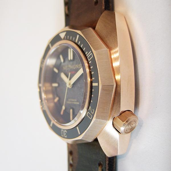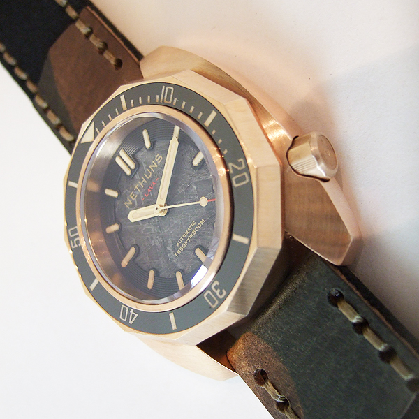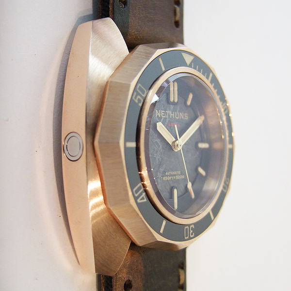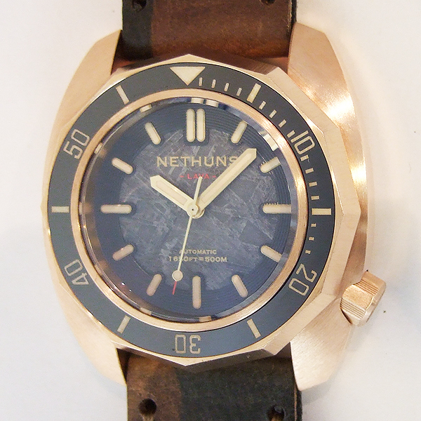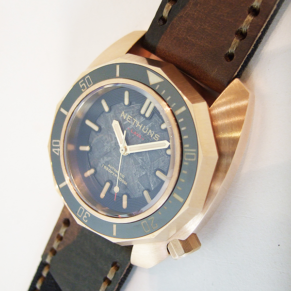 簡述: NETHUNS 義大利品牌 LAV 系列潛水腕錶/ 全球限量99只/ 型號:LB121/ 採日本精工 NH35 自動上鏈機芯/ 機芯為:24石ˋ動力儲存約:40小時/ 具時ˋ分ˋ指示/ 太空磒石面盤/ 舊化時標(具夜光效果)/ 青銅材質錶殼,錶冠於 4 點方位,排氦筏 9 點方位/ 金色指針(具夜光效果)/ 黑色陶瓷可單向旋轉潛水外圈,可計算入水時間/ 手錶尺寸: 45mm錶徑/ 藍寶石水晶玻璃鏡面/ 霧面鋼錶底蓋/ 搭配 24mm 原廠帆布及皮質錶帶,可雙面使用/ ㄇ字型一般青銅材質錶扣/ 防水: 500米.