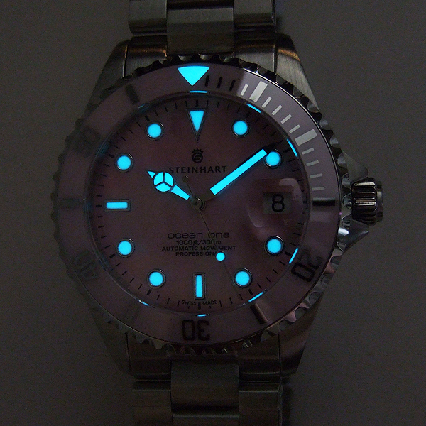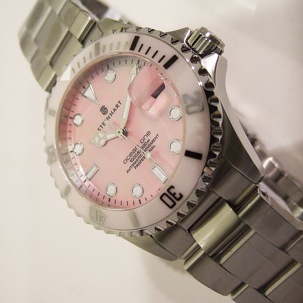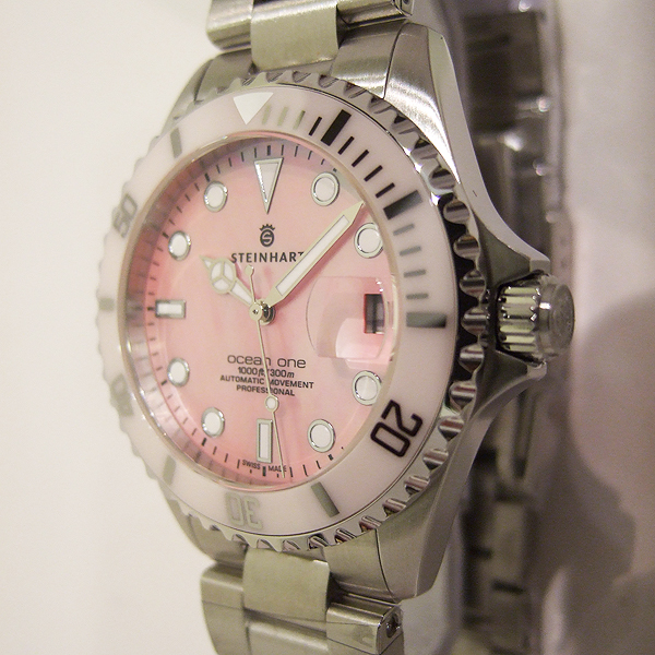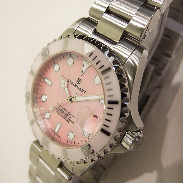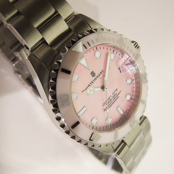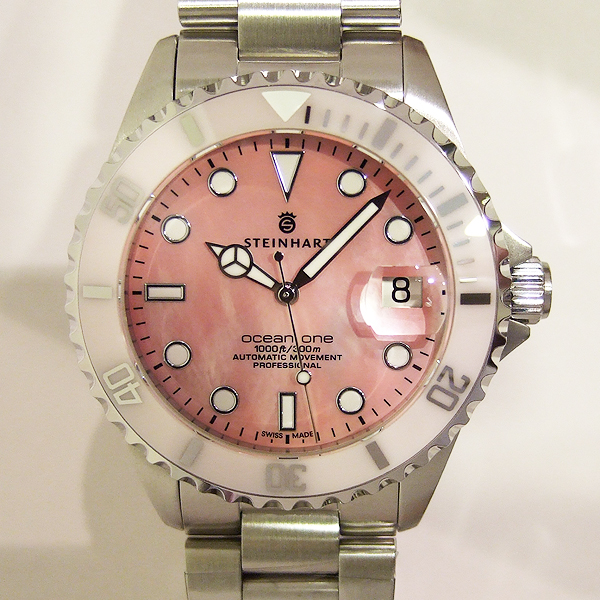 簡述: Steinhart 德國品牌潛水錶/ OCEAN One 39 pink 腕錶/ 型號:103-0723/ 採瑞士自動上鏈機芯, 動力儲存:42小時/ 具時ˋ分ˋ秒指示及 3 點方位日期顯示/ 粉紅色珍珠母貝色面盤/ 夜光指針及標誌型時標/ 全錶拋霧 316 L 不鏽鋼材質/ 粉紅色陶瓷材質單向旋轉外圈,可計算入水時間/ 手錶尺寸: 39mm 錶徑,厚:13mm , 重 170 克/ 防炫藍寶石水晶水晶玻璃(3 點方位日期放大鏡)/ 搭配原廠蠔式錶帶及折疊式錶扣/ 防水: 300 米.