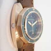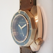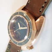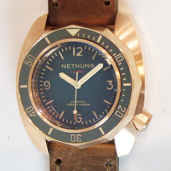 簡述: NETHUNS 義大利品牌 LAV 系列潛水腕錶/ 型號:LB112/ 採日本精工 NH35 自動上鏈機芯/ 機芯為:24石ˋ動力儲存約:40小時/ 具時ˋ分ˋ指示/ 綠色阿拉伯數字面盤/ 舊化時標(具夜光效果)/ 青銅材質錶殼,錶冠於 4 點方位,排氦筏 9 點方位/ 金色指針(具夜光效果)/ 綠色陶瓷可單向旋轉潛水外圈,可計算入水時間/ 手錶尺寸: 45mm錶徑/ 藍寶石水晶玻璃鏡面/ 霧面鋼錶底蓋/ 搭配 24mm 原廠帆布及皮質錶帶,可雙面使用/ ㄇ字型一般青銅材質錶扣/ 防水: 500米.