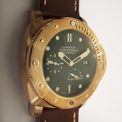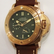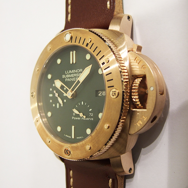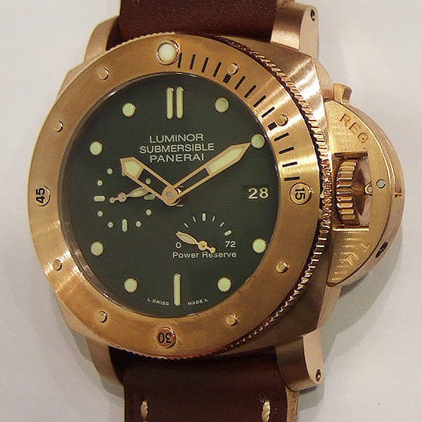 簡述: Luminor Submersible 1950 3 Days Automatic Bronzo–47mm/ 型號:PAM00507/ P 字頭限量製作 1000 只/ 採用沛納海P.9000自動上鏈機芯,機芯完全由沛納海自製,機芯為:13 3/4法分,厚7.9毫米,28石,Glucydur平衡擺輪,每小時震頻28,800次,Incabloc防震裝置,2個發條盒,具72小時動能儲存(3 天)/ 具時ˋ分ˋ小秒指示,日期顯示視窗, 72 小時動力儲存顯示/ 專利防水錶冠護橋裝置/ 錶徑:47mm,磨砂青銅合金/ 單向逆時針方向旋轉潛水計時錶圈,可計算潛水時間刻度以分鐘為單位的固定爪/ 綠色面盤/ 夜光指針與時標/ 藍寶石水晶鏡面,厚度 4 毫米,具抗訪光塗層/ 錶背磨砂鈦合金材質及透明水晶玻璃/ 防水300米/ 附原廠皮帶搭配大型鈦合金錶扣(錶扣上有 PANERAI 字樣).