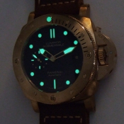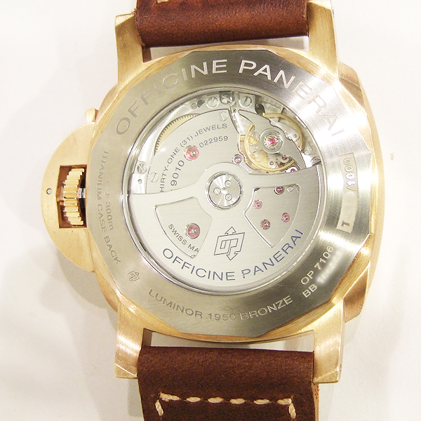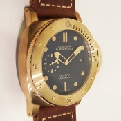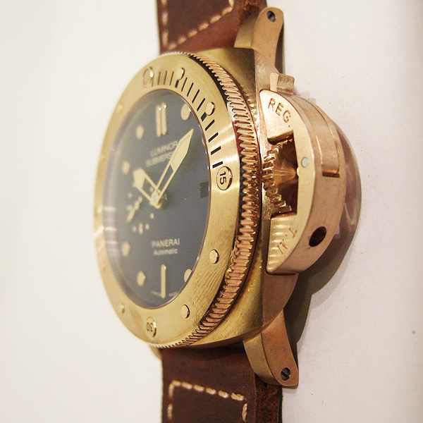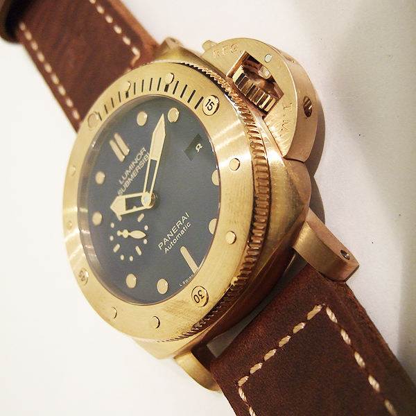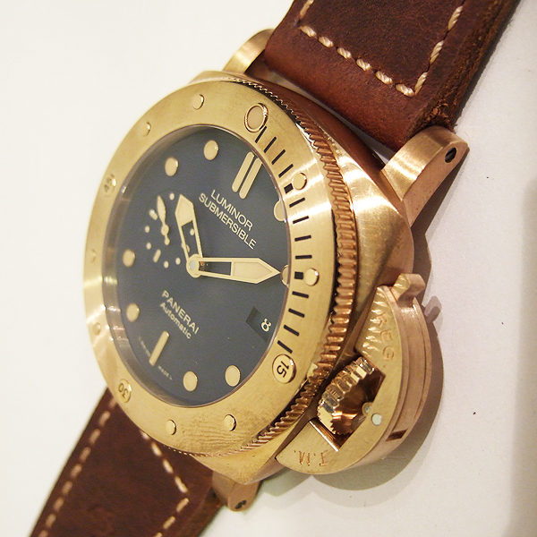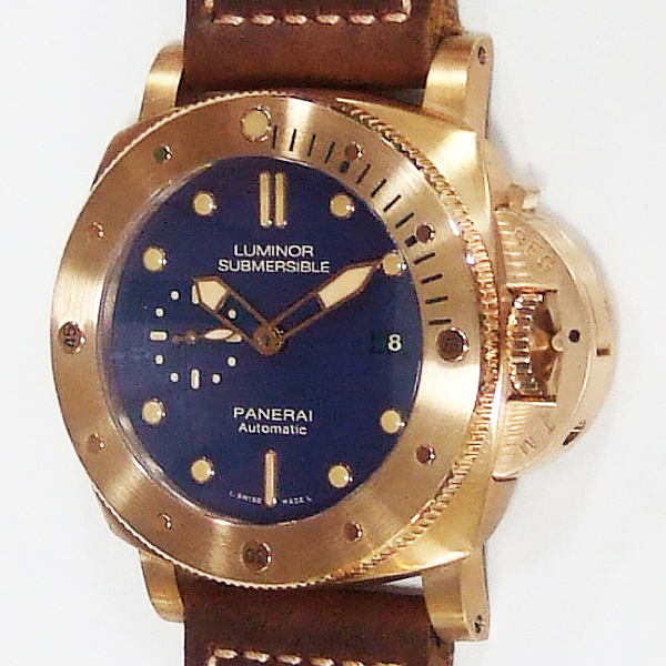 簡述: Luminor Submersible 1950 3 Days Automatic Bronzo–47mm/ 型號:PAM00671/ S 字頭限量製作 1000 只/ 採用沛納海P.9010自動上鏈機芯,機芯完全由沛納海自製,機芯為:13 3/4法分,厚7.9毫米,28石,Glucydur平衡擺輪,每小時震頻28,800次,Incabloc防震裝置,2個發條盒,具72小時動能儲存(3 天)/ 具時ˋ分ˋ小秒指示,日期顯示視窗/ 專利防水錶冠護橋裝置/ 錶徑:47mm,磨砂青銅合金/ 單向逆時針方向旋轉潛水計時錶圈,可計算潛水時間刻度以分鐘為單位的固定爪/ 藍色面盤/ 夜光指針與時標/ 藍寶石水晶鏡面,厚度 4 毫米,具抗訪光塗層/ 錶背磨砂鈦合金材質及透明水晶玻璃/ 防水300米/ 附原廠皮帶搭配大型鈦合金錶扣(錶扣上有 PANERAI 字樣).