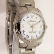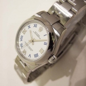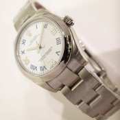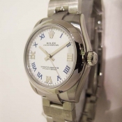 簡述: 蠔式女裝腕錶/ 號:179171/ 採自動上鏈機芯/ 機芯:五方位調校,雙層合金游絲,有四顆微調快慢螺絲,橫跨式擺輪橋板,KIF避振裝置,天文台認證(C.O.S.C.)/ 錶徑:31mm/ 具時ˋ分ˋ秒針指示/ 白色面盤/ 銀色指針及銀色立體及藍色印刷羅馬數字時標/ 全錶 904 L 不銹鋼材質/ 錶盤內圈刻有一圈防偽 ROLEX 字樣及流水號碼/ 藍寶石水晶玻璃鏡面/ 原廠蠔式錶帶及折疊式錶扣/ 防水100米.