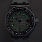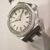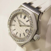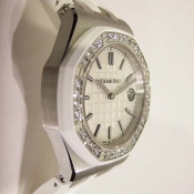 簡述: 皇家橡樹離岸型鑽錶/ 型號:67540.SK.A010CA.01/ 採原廠石英機芯,機芯編號:2714/ 錶徑:37mm,厚11.1mm/ 具時ˋ分指示及 3 點方位日期顯示窗/白色格紋面盤/ 夜光標誌型時標及指針/ 錶框上原廠原鑲32 顆美鑽,共約1.02克拉/ 藍寶石水晶玻璃/ 防水50米/ 搭配原廠白色膠帶及鋼質ㄇ形一般穿扣.