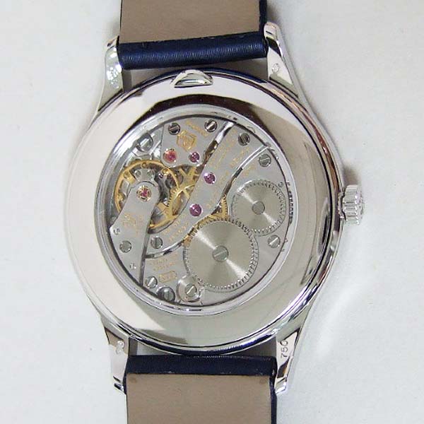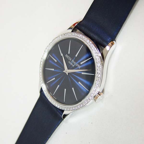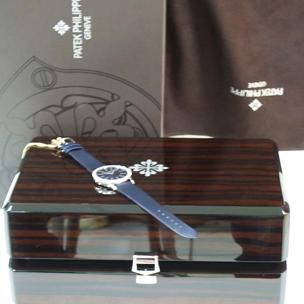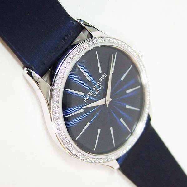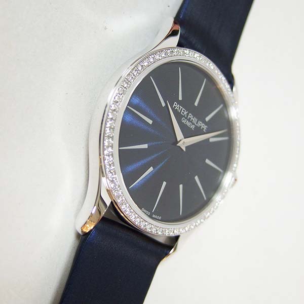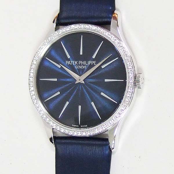 簡述: P.P. 百達翡麗女裝腕錶/ 型號:4897G-001/ 採原廠編號:215 手機芯/ 具時ˋ分指示/ 錶徑:33mm/ 湛藍色波紋面盤/ 銀灰色立體刻度時標/ 錶殼原鑲錶圈鑽飾/ 藍寶石水晶玻璃鏡面/ 原廠深藍色裐質皮帶及18K白金ㄇ型錶扣/ 日常生活防水30米.