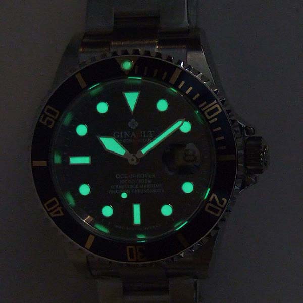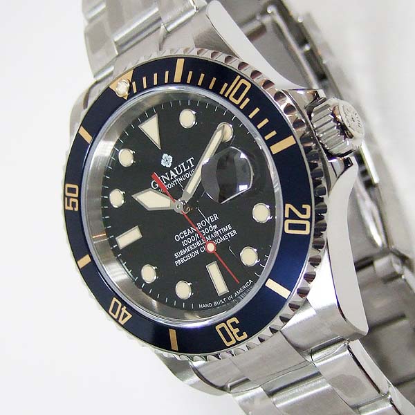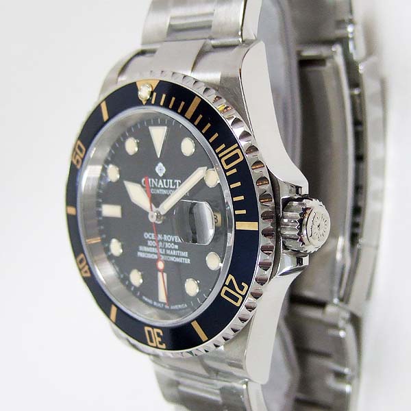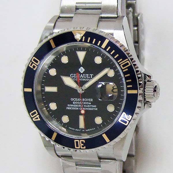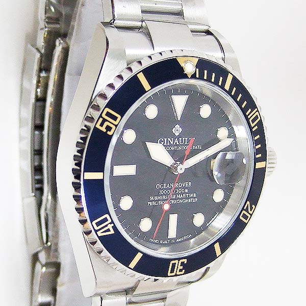 簡述: GINAULT 吉諾美國品牌潛水錶/ 型號:181875GSLID/ 採原廠自製編號:7275 自動上鏈機芯, 動力儲存:38小時/ 具時ˋ分ˋ秒指示及 3 點方位日期窗放大鏡顯示/ 黑色面盤, 6 點方位4排白字/ 舊化夜光指針及標誌型時標/ 全錶拋霧 316 L 不鏽鋼材質/ 藍配金色潛水時標單向旋轉外圈,可計算入水時間/ 手錶尺寸: 40mm 錶徑/ 30.4弧形藍寶石水晶水晶玻璃/ 搭配原廠蠔式錶帶及折疊式錶扣/ 防水: 300 米(ISO 6425 認證潛水錶).