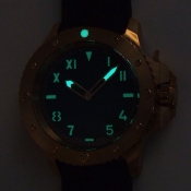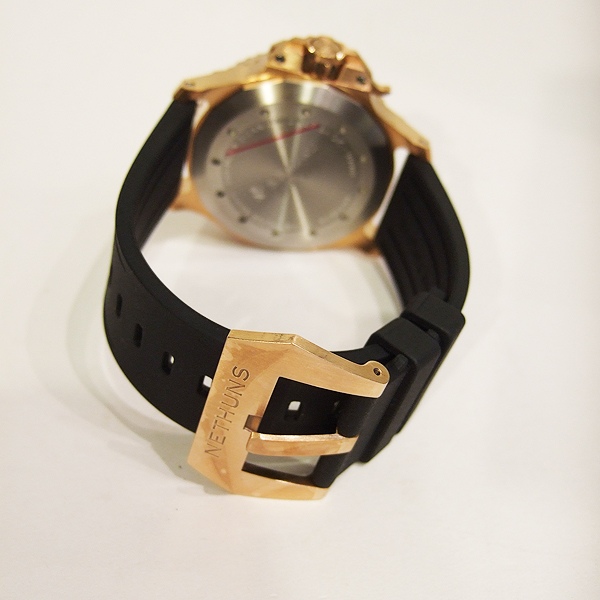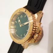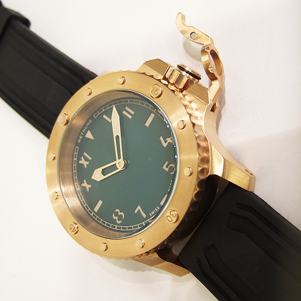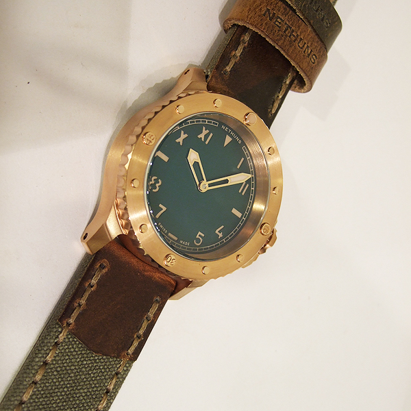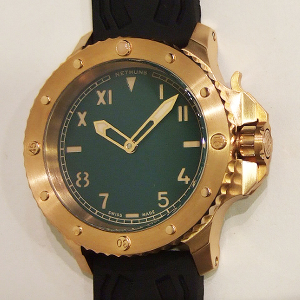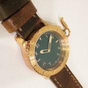 簡述: NETHUNS 義大利品牌青銅腕錶/ 型號:5.2.1.7.02/ 採瑞士 Unitas 6497-1 手上鏈機芯/ 機芯為:17石ˋ動力儲存:46小時/ 具時ˋ分指示/ 綠色三明治面盤/ 羅馬數字時標及阿拉伯數字面盤(加州面)及標誌線分標/ 青銅色指針(具夜光效果)/ 可單向旋轉潛水外圈,可計算入水時間/ 特殊錶冠護橋/ 手錶尺寸: 45mm錶徑/ 防炫藍寶石水晶玻璃鏡面/ 霧面鈦合金錶底蓋,厚:3.7mm/ 搭配 24mm 原廠黑色橡膠錶帶及咖啡色舊化皮錶帶方便更換/ ㄇ字型青銅質錶扣/ 防水: 300米.