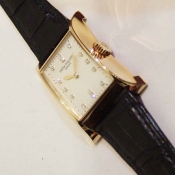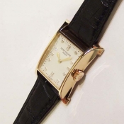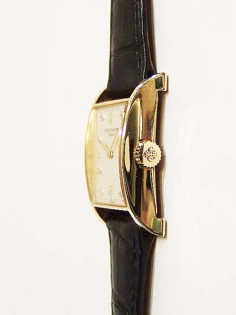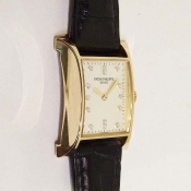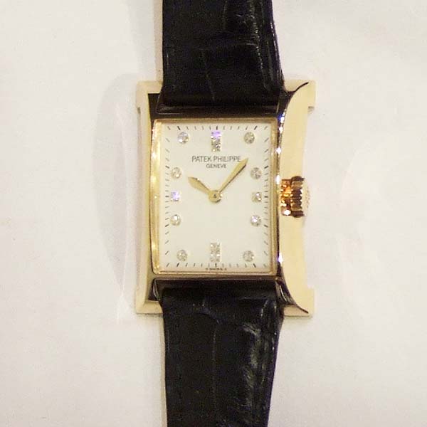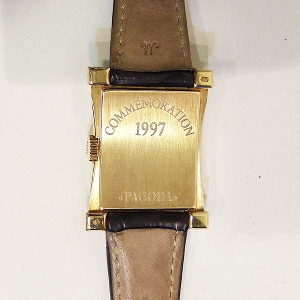 P.P. 百達翡麗 PAGODA 女裝腕錶/ 型號:4900-001/ 採原廠手上鏈機芯/ 具時ˋ分指示/ 錶徑:33 X 25mm/ 銀白色面盤/ 原廠立體鑽飾刻度時標/ 錶背刻有 1997 字樣/ 藍寶石水晶玻璃鏡面/ 原廠黑色鱷魚皮帶及18K黃金ㄇ型錶扣/ 日常生活防水30米. |