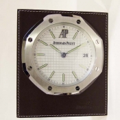 皇家橡樹型 8 日鏈座鐘/ REF:2690/ 採手動上鏈機芯/ 尺寸:高 150 mm,寬 12.8 mm,厚 30mm ,底座寬 68 mm/ 具時ˋ分ˋ針指示及 3 點方位日期顯示窗/ 銀白格紋面盤/ 標誌型時標及指針/ 8 日鏈機芯/ 藍寶石水晶玻璃/ 框架咖啡色皮質包覆.
