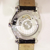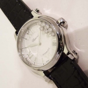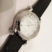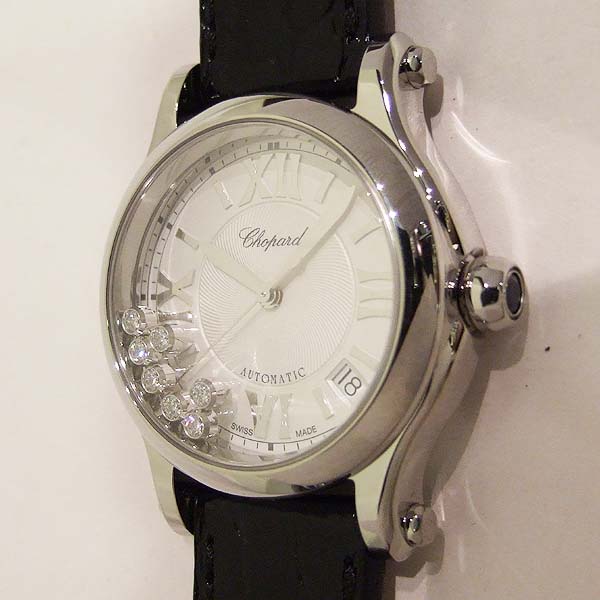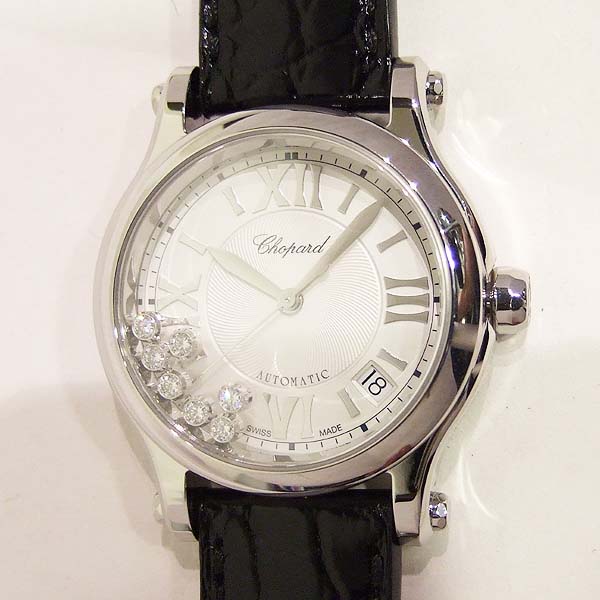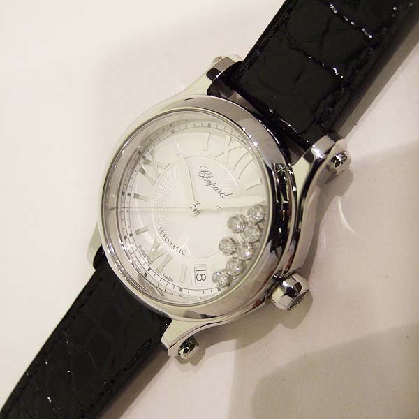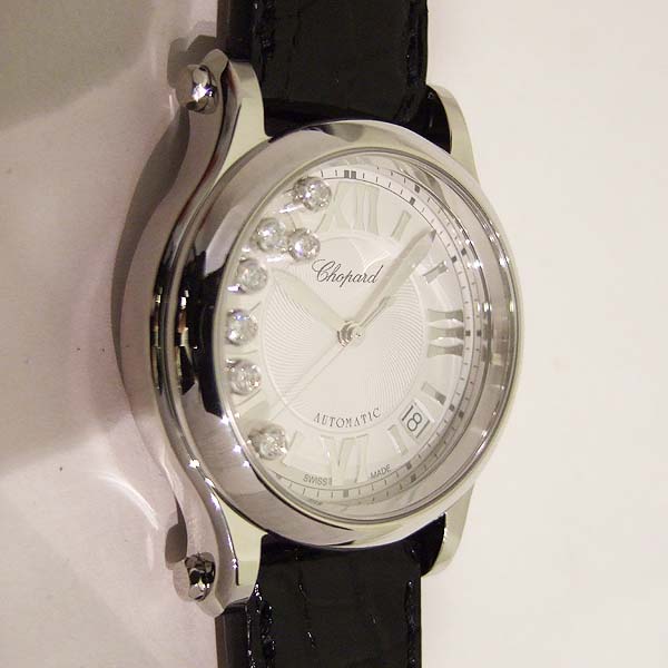簡述: 蕭邦 Happy Sport 女裝腕錶/ 型號:27/8559-3001/ 採用原廠自動上鏈機芯,25顆紅寶石,動力儲存 42 小時 / 具時ˋ分ˋ秒指示,4~5點間日期視窗/ 銀色錶面,刻花飾紋/ 7 顆原廠滑動鑽飾/ 銀色羅馬數字及標線型立體時標/ 劍型銀色指針/ 鋼質錶殼/ 手錶尺寸錶徑為: 36mm/ 藍寶石水晶鏡面/ 搭配原廠黑色鱷魚皮錶錶帶及一般穿扣/ 日常生活防水 30 米.